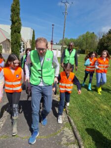 Au travers des sentiers piétonniers du village et autour de la zone humide, avec Pascal, René et Nathalie, des bénévoles de l’association « ETINCELLE 53 », les enfants de primaire ont accompagné et même aidé à la conduite de la JOËLETTE dans laquelle DIANA avait pris place pour une balade insolite.