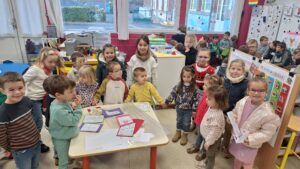 Dans le cadre du calendrier de l’Avent de l’école, les enfants devaient offrir quelque chose à un camarade d’une autre classe après un tirage au sort. Ce jeudi 19 décembre, les enfants ont échangé leurs “cadeaux” : dessin, bricolage, mots, carte, coloriage…