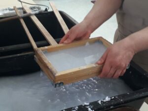 Les enfants ont alors pu manipuler cette pâte : chacun en a prélevé une portion qu’il a déposée dans un tamis, en prenant soin de bien laisser l’eau s’écouler. Ils ont ensuite basculé la pâte aplatie pour la faire glisser sur leur plateau. Le papier ainsi formé a été mis à sécher pendant au minimum 48 heures.