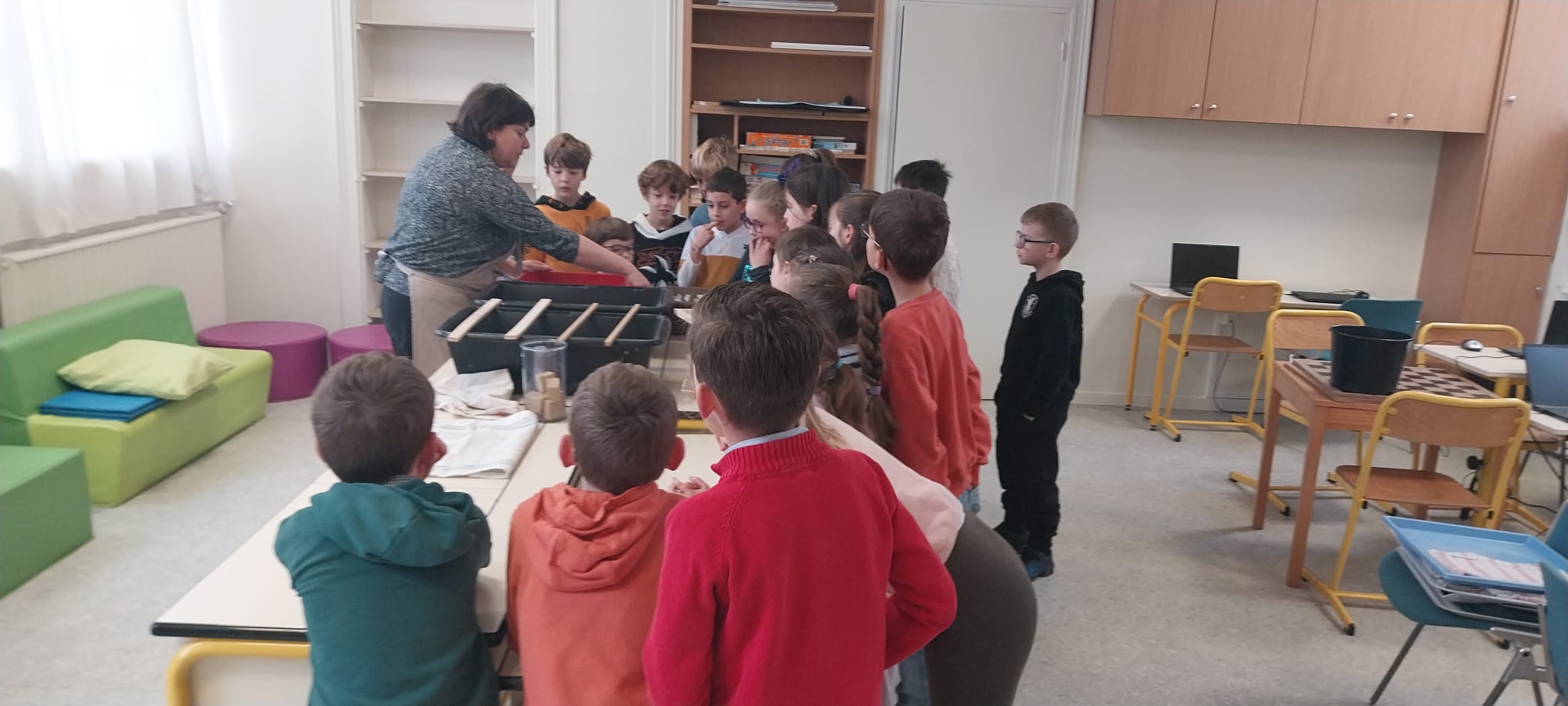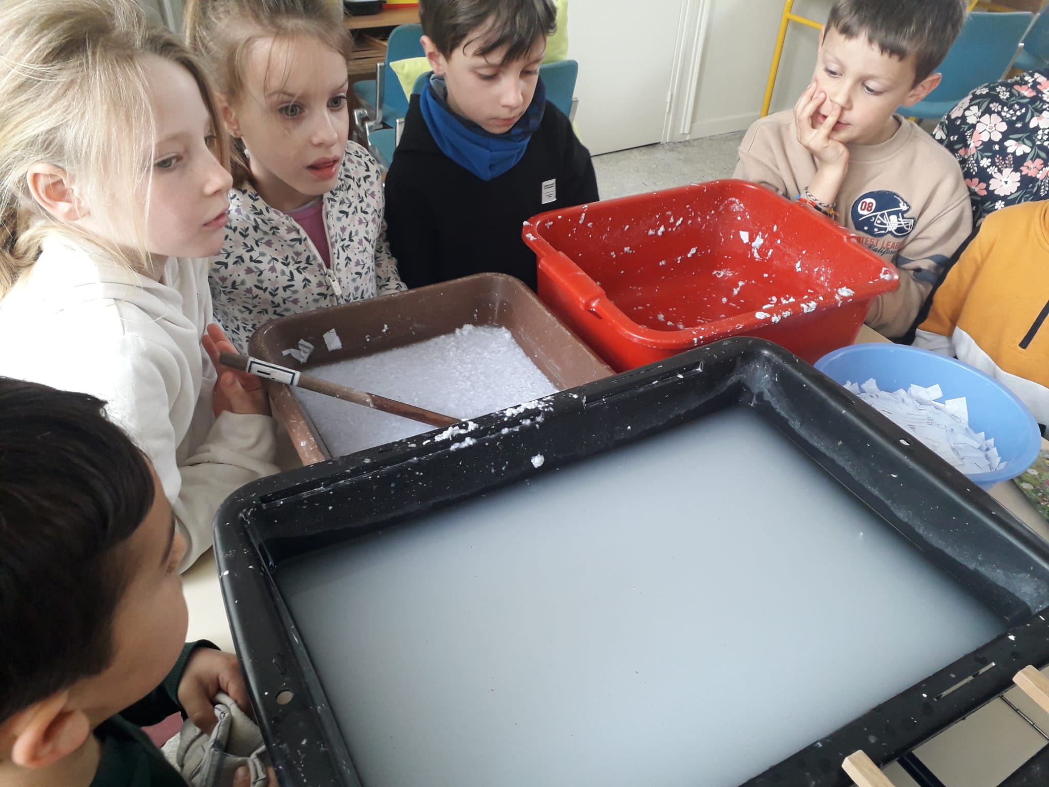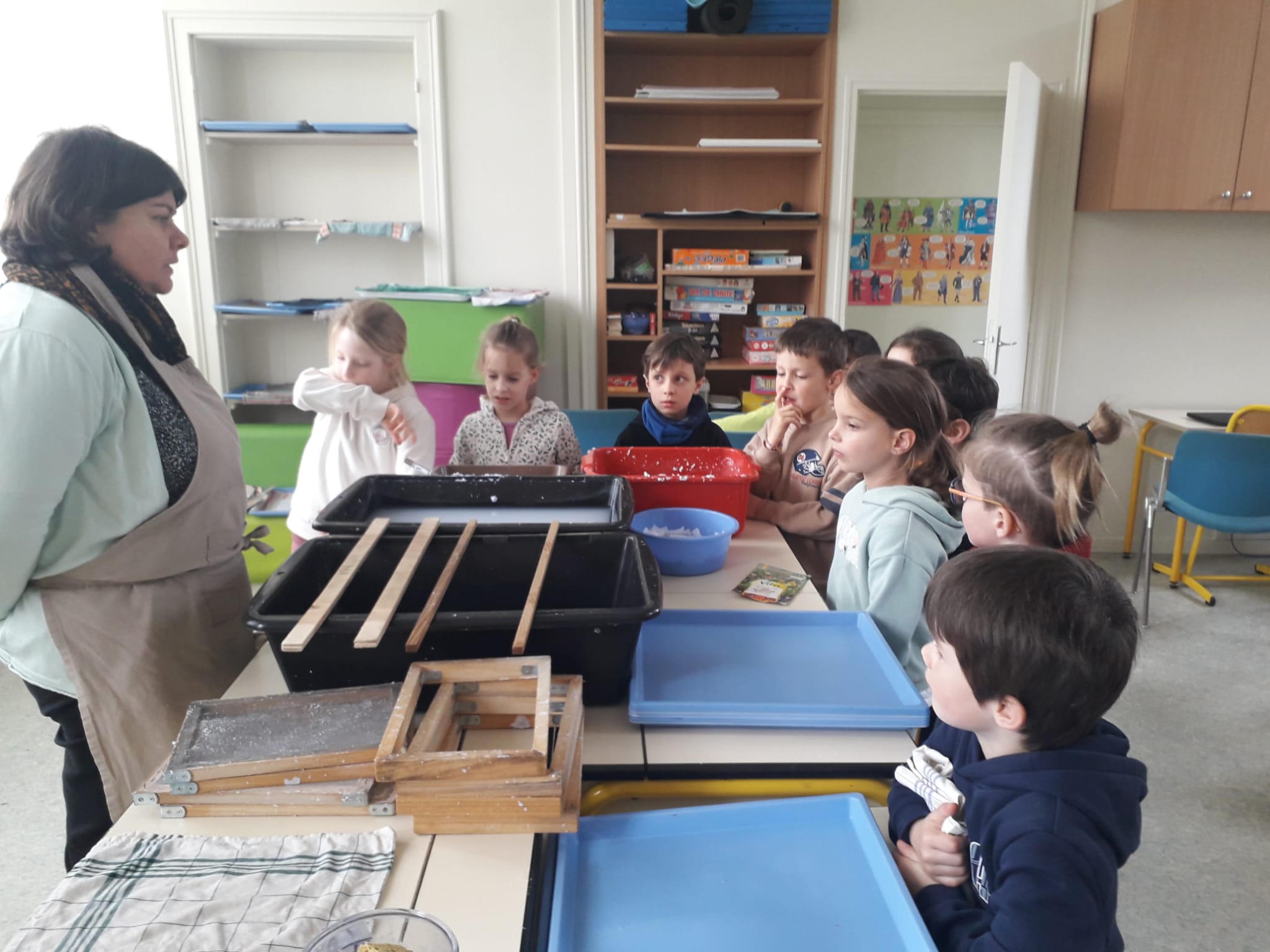 Cette intervention s’est déroulée le mardi 10 mars : le matin pour les élèves de CE1-CE2, puis l’après-midi pour les CP. Tout au long de la séance, les enfants ont découvert les différentes étapes de fabrication du papier recyclé, une activité à la fois ludique et riche en apprentissages.