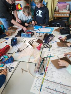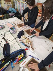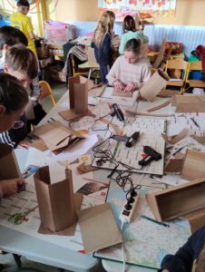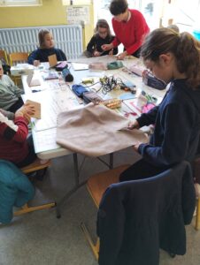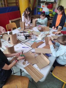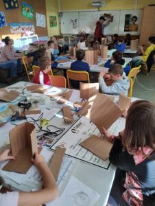 Après quelques minutes de présentation et d’explications techniques, les élèves ont commencé par dessiner de face et de profil leur future marionnette. Ensuite est rapidement arrivée, l’étape de la confection de la mâchoire avec du carton et du tissu. L’après midi, les enfants ont construit le visage.