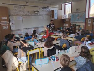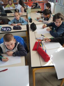 Cette rencontre de 2h a pu se faire grâce à Hélène de la bibliothèque. Durant 1h, les enfants ont échangé avec l’illustratrice afin de découvrir le métier. La seconde heure les enfants avaient un travail à réaliser.